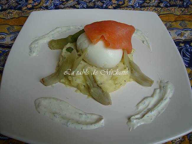 L’œuf poché chaud ou tiède (vous pouvez le repasser au micro ondes quelques secondes à four pas trop chaud).