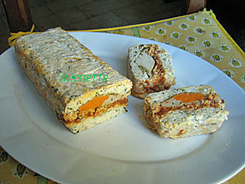 La moitié de la farce de poisson, la tomate séchée, la farce de crevettes, la purée d’olives vertes, les st Jacques et autour les câpres, terminer par l’autre moitié de farce de poisson, fermer la terrine avec le film.
