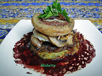 La galette de p de terre, les oignons confits, un tournedos, les chips de navet, les champignons et terminer par le second morceau de viande. (Enlever le gras du tour au moment de déguster sinon le morceau de viande ne sera pas très présentable).